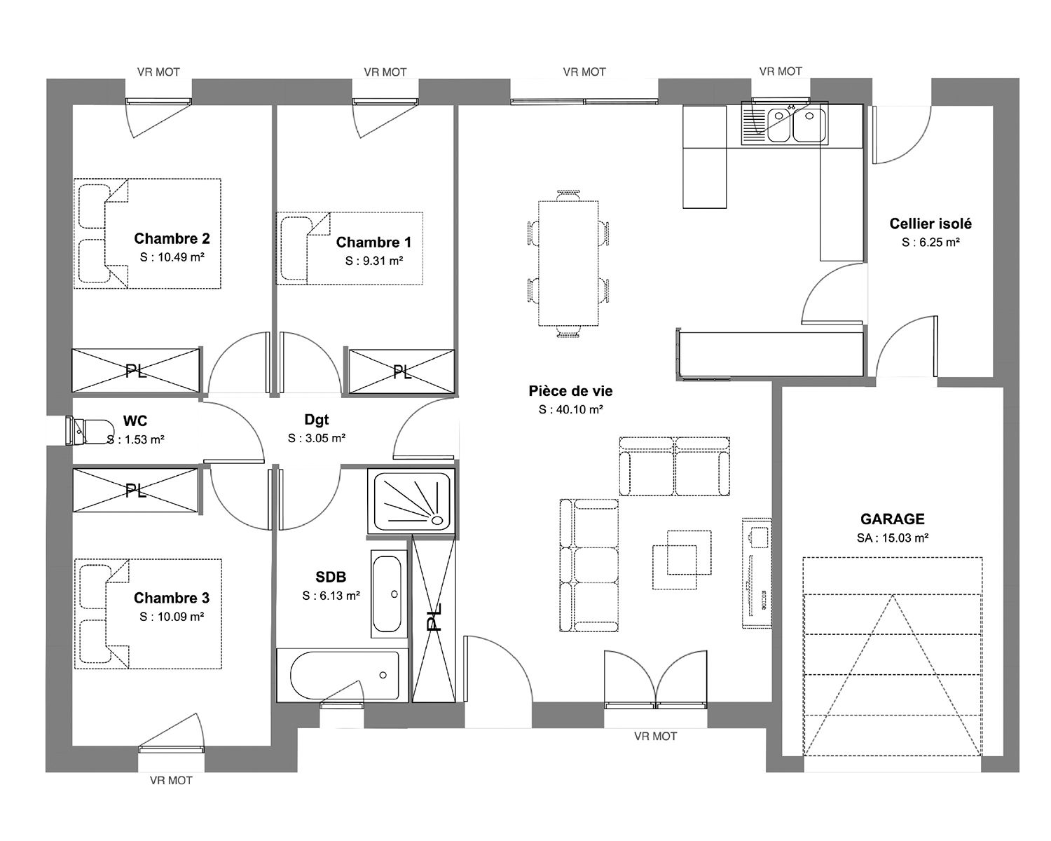 Prix avec assurance dommages-ouvrage comprise, terrain viabilisé, adaptation non comprise, assainissement compris, frais de notaire non compris, taxes non comprises, frais divers non compris. Compris système de chauffage en PAC Air/Air avec split, carrelage partout et parquet dans les chambres, porte de garage sectionnelle, volets roulants motorisés. Non compris : les peintures, meuble de salle de bain, cuisine et VRD. Terrain sélectionné et vu pour vous sous réserve de disponibilité et au prix indiqué par notre partenaire foncier. Conditions et visuels non contractuels.